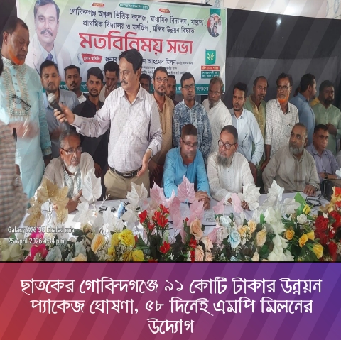 শনিবার (২৫ এপ্রিল) বিকেলে গোবিন্দগঞ্জ সায়মা সাদি মহল কমিউনিটি সেন্টারে স্থানীয় শিক্ষা প্রতিষ্ঠান প্রধান, ব্যবস্থাপনা কমিটির সদস্য এবং বিএনপির নেতৃবৃন্দের সঙ্গে মতবিনিময় সভায় তিনি এ ঘোষণা দেন। সভায় সভাপতিত্ব করেন গোবিন্দগঞ্জ–সৈদেরগাঁও ইউনিয়ন বিএনপির সাবেক সভাপতি রুহুল আমিন।