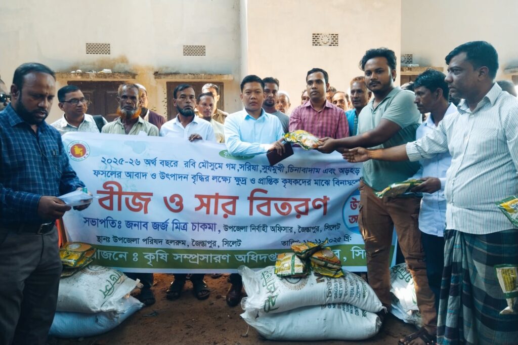 জৈন্তাপুরে ক্ষুদ্র ও প্রান্তিক কৃষকদের মাঝে বিনামূল্যে সার-বীজ বিতরণ
