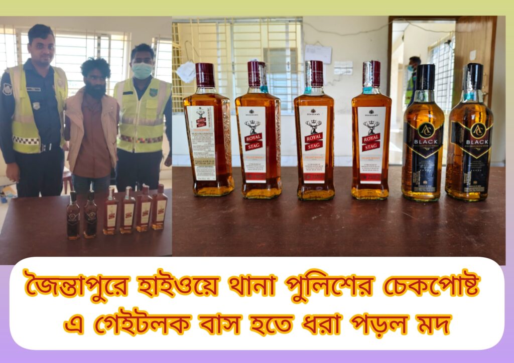 জৈন্তাপুর হাইওয়ে থানা পুলিশ সূত্রে জানায় ৭ ডিসেম্বর রবিবার গোপন সংবাদের ভিত্তিত্বে সকাল সাড়ে ১১টায় সিলেট-তামাবিল মহাসড়কে কাটাগং হাইওয়ে থানার সম্মুখে হাইওয়ে পুলিশ চেকপোষ্ট পরিচালনা করে। এসময় জাফলং হতে ছেড়ে আসা সিলেটগামী গেইটলক বাস (ঢাকা মেট্রো-ব-১১-৯৭৯৬) চেকপোষ্টে থামানে হলে একজান যাত্রীবেশি মাদক ব্যবসায়ী জানালাি দিয়ে পালিয়ে যাওয়ার চেষ্টা করে। হাইওয়ে থানা পুলিশের সদস্যরা তাৎক্ষনিক ভাবে থাকে আটক করে। পরে গোইটলক বাসগাড়ীটি তল্লাসী চালিয়ে একটি শপিং ব্যাগ উদ্ধার করে ব্যাগের মধ্য হতে রয়েল স্টেজ ৪বোতল ও এসি ব্লাক ২বোতল সহ মোট ৬ বোতল ভারতীয় মদ উদ্ধার করে। পরে পুলিশৈর জিজ্ঞাসাবাদেেআটককৃত ব্যক্তি স্বীকার করে মদ গুলো সে বহন করছে।