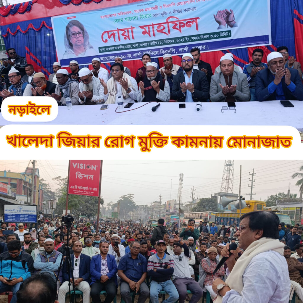 বেনাপোল প্রতিনিধি: বিএনপি চেয়ারপার্সন ও সাবেক প্রধানমন্ত্রী দেশনেত্রী বেগম খালেদা জিয়ার রোগ মুক্তি ও সুস্থতা কামনায় যশোরের শার্শায় দোয়া মাহফিল অনুষ্ঠিত হয়েছে। বুধবার বিকালে শার্শা সদর ইউনিয়ন বিএনপির আয়োজনে নাভারণ সাতক্ষীরা মোড়ে এই দোয়া অনুষ্ঠিত হয়। শার্শা ইউনিয়ন বিএনপির সভাপতি ওসমান আলীর সভাপতিত্বে ও সাবেক ছাত্রনেতা উপজেলা স্বেচ্ছাসেবক দলের সিনিয়র যুগ্ম আহবায়ক ওয়াসি উদ্দিনের সঞ্চালনায় দোয়া অনুষ্ঠানে উপস্থিত ছিলেন, উপজেলার বিএনপির সভাপতি আবুল হাসান জহির, প্রধান উপদেষ্টা খায়রুজ্জামান মধু, উপজেলা বিএনপির সাধারণ সম্পাদক নুরুজ্জামান লিটন উপজেলা বিএনপির সহ-সভাপতি আহম্মদ আলী শাহিন, জামাল উদ্দিন, উপজেলা বিএনপির যুগ্ম সম্পাদক এডভোকেট মোস্তফা কামাল মিন্টু ও প্রভাষক মানুনুর রশিদ, বেনাপোল পৌর বিএনপির সহ-সভাপতি আতিকুজ্জামান সনি, সাংগঠনিক সম্পাদক আখতার হোসেন, কায়বা ইউনিয়ন বিএনপির সভাপতি রবিউল হোসেন, বাহাদুরপুর ইউনিয়ন বিএনপির সভাপতি সাহেব আলী বিশ্বাস, নিজামপুর ইউনিয়ন বিএনপির সভাপতি আব্দুস সালাম, ডিহি ইউনিয়ন বিএনপির সভাপতি ওলিয়ার রহমান, গোগা ইউনিয়ন বিএনপির সভাপতি মোহাম্মদ আলী, লক্ষনপুর ইউনিয়ন বিএনপির সভাপতি আহসান হাবীব খোকন, বাগআঁচড়া ইউনিয়ন বিএনপির সাধারণ সম্পাদক জাহাঙ্গীর হোসেন, উলাশী ইউনিয়ন বিএনপির সাধারণ সম্পাদক রুহুল আমিন, ডিহি ইউনিয়ন বিএনপির সাধারণ সম্পাদক আব্দুল জব্বার, শার্শা ইউনিয়ন বিএনপির সাধারণ সম্পাদক ইসমাইল হোসেন শান্তি, বেনাপোল ইউনিয়ন বিএনপির সাধারণ সম্পাদক আবুল কাশেম, গোগা ইউনিয়ন বিএনপির সাংগঠনিক সম্পাদক আব্দুল মালেক, ডিহি ইউনিয়ন বিএনপির সাংগঠনিক সম্পাদক সালাহ উদ্দিন, কায়বা ইউনিয়ন বিএনপির সাংগঠনিক সম্পাদক ওলিয়ার রহমান, লক্ষনপুর ইউনিয়ন বিএনপির সাংগঠনিক সম্পাদক তোফাজ্জেল হোসেন লিটন, উপজেলা কৃষক দলের সাধারণ সম্পাদক শাখাওয়াত হোসেন, উপজেলা স্বেচ্ছাসেবক দলের সদস্য সচিব সেলিম হোসেন আশা সহ অংগ ও সহযোগী সংগঠনের বিভিন্ন পর্যায়ের নেতৃবৃন্দ, স্থানীয় গণমান্য ব্যক্তি ও আলেম ওলামারা উপস্থিত ছিলেন। এ সময় বেগম খালেদা জিয়ার দ্রুত আরোগ্য এবং দীর্ঘায়ু কামনা করে দোয়া করা হয়। দোয়া অনুষ্ঠান পরিচালনা করেন নাভারণ বাজার কেন্দ্রীয় জামে মসজিদের ঈমাম মুফতী আব্দুস সামাদ কাশেমী।
