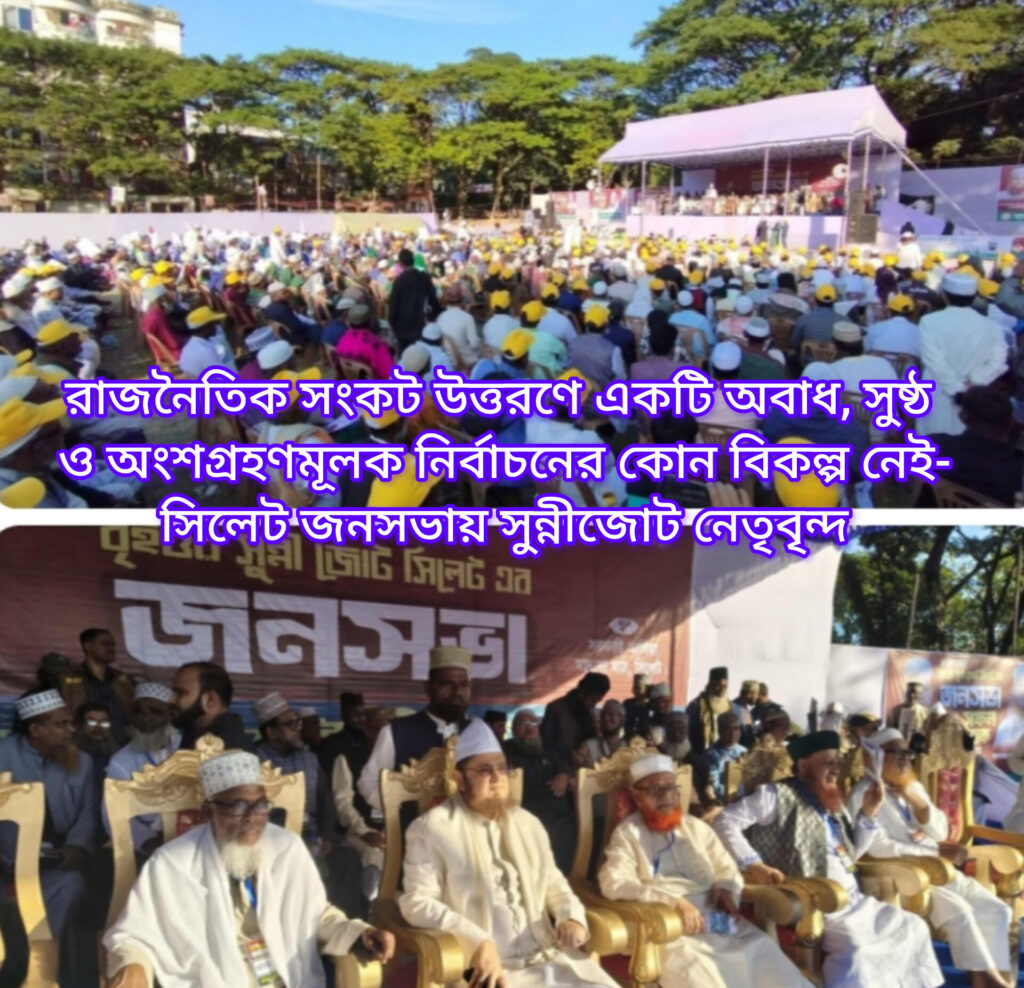 সালেহ আহমদ (স’লিপক): আগামী ফেব্রুয়ারিতে ঘোষিত জাতীয় নির্বাচন নিশ্চিত করা, রাষ্ট্রীয় সংলাপে এবং জুলাই সনদে সকল নিবন্ধিত রাজনৈতিক দলকে অংশগ্রহণের সমান সুযোগ দেয়া, দূর্নীতিবাজ কালোর টাকার মালিক ও দণ্ডিতদের নির্বাচনে অযোগ্য ঘোষণা করা, মাজার মসজিদ খানকায় হামলায় জড়িতদের বিচার, জুলাই বিপ্লব ও পরবর্তী সময়ে সংঘটিত সব হত্যার বিচার করা এবং মবসন্ত্রাস থামানো সহ ১৩ দফা দাবিতে সিলেটে বৃহত্তর সুন্নী জোটের বিশাল জনসভা অনুষ্ঠিত হয়েছে।