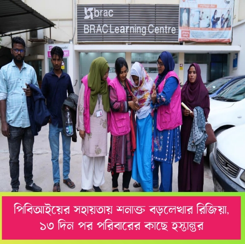 পরবর্তীতে Police Bureau of Investigation (পিবিআই) রিজিয়ার আঙুলের ছাপ সংগ্রহ করে জাতীয় পরিচয়পত্রের তথ্যভাণ্ডারের সঙ্গে মিলিয়ে তাঁর পরিচয় নিশ্চিত করে। জানা যায়, তাঁর বাড়ি মৌলভীবাজারের বড়লেখা উপজেলার দক্ষিণ শাহবাজপুর ইউনিয়নের মোহাম্মদনগর গ্রামে। দীর্ঘদিন যোগাযোগ না থাকায় পরিবার ধরেই নিয়েছিল—রিজিয়া আর বেঁচে নেই। মঙ্গলবার (২৪ ফেব্রুয়ারি) উত্তরায় ব্র্যাকের মাইগ্রেশন ওয়েলফেয়ার সেন্টারে আনুষ্ঠানিকভাবে তাঁকে পরিবারের কাছে হস্তান্তর করা হয়।